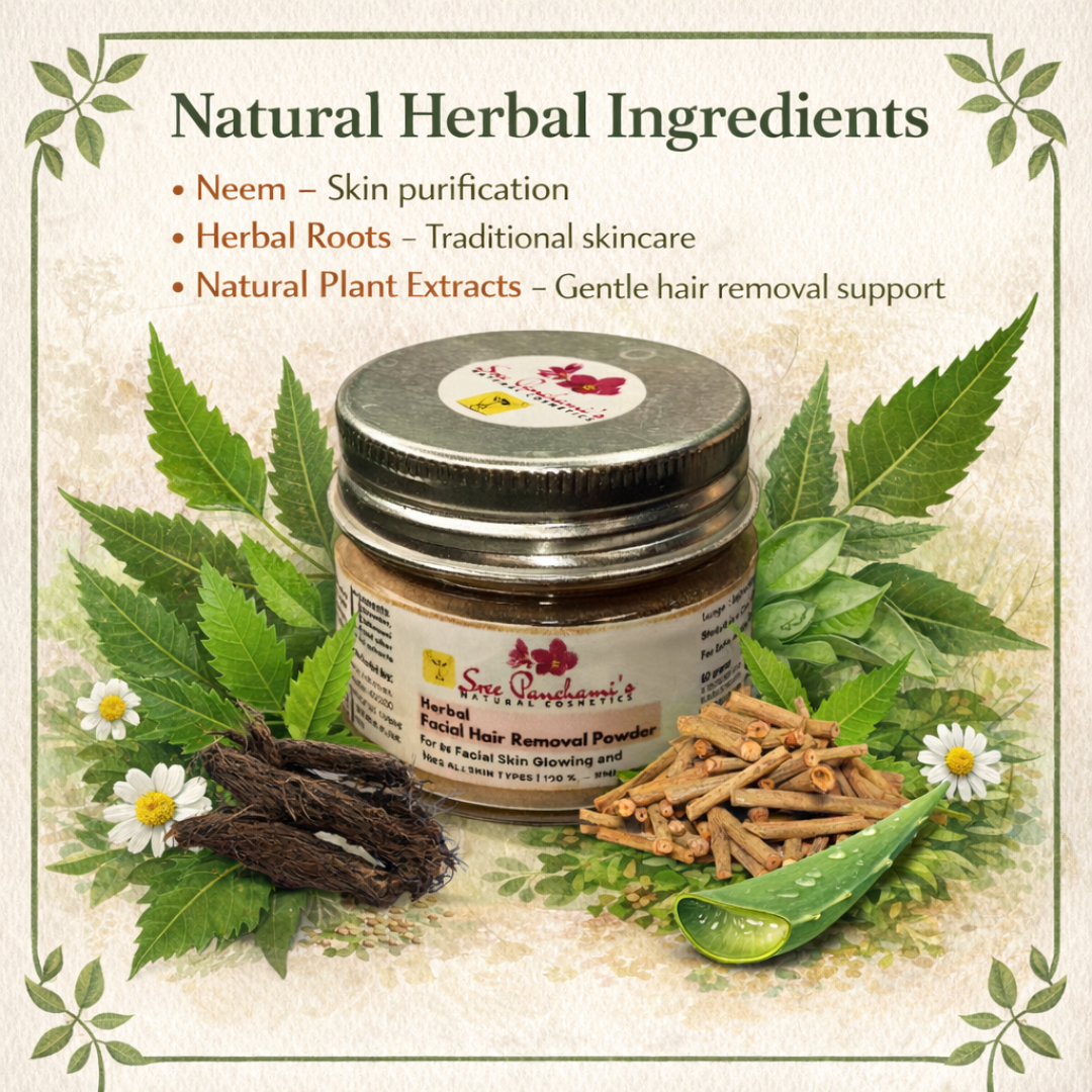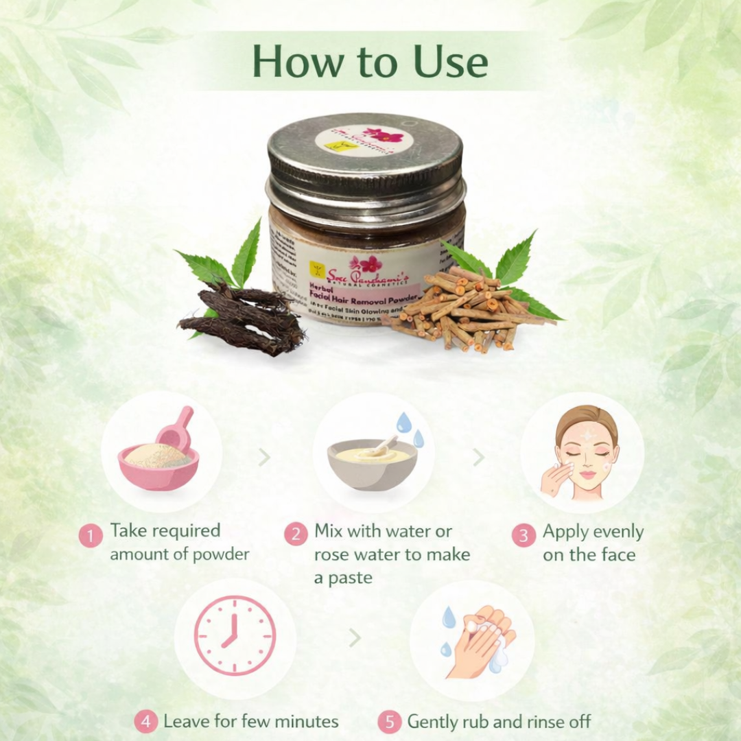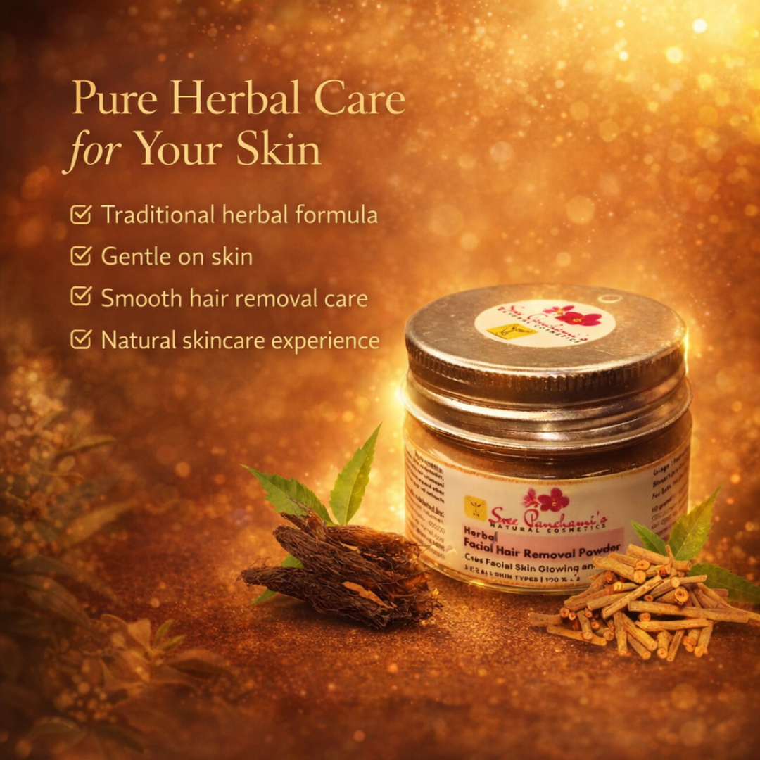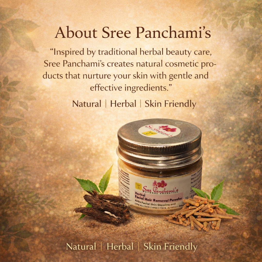 Say goodbye to harsh chemicals and painful methods – and hello to gentle, effective hair removal! Introducing Sreepanchami’s Facial Hair Removal Herbal Powder – your skin’s new best friend for a smooth, radiant look. This natural, Ayurvedic-inspired formula gently removes facial hair while soothing the skin and enhancing your glow.