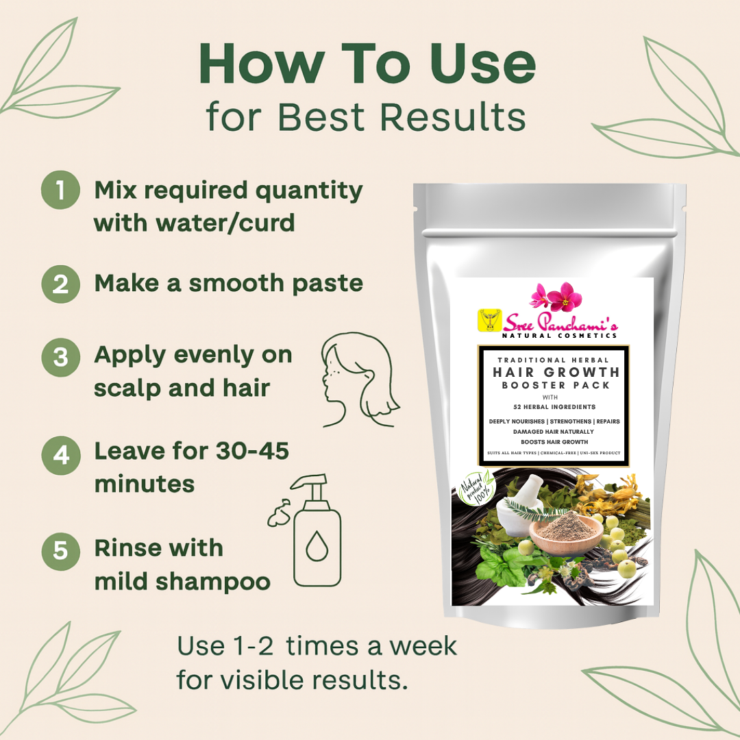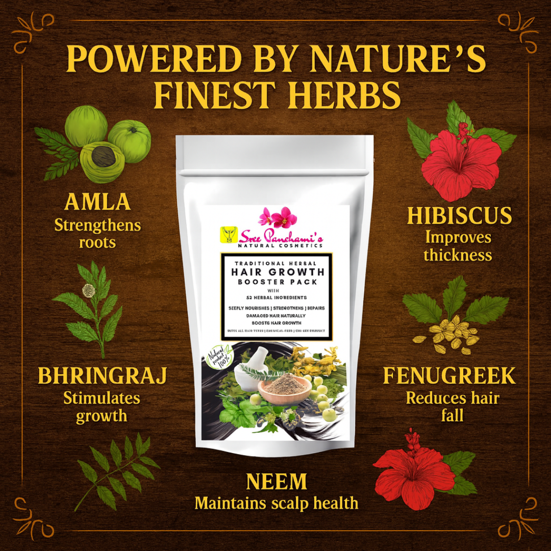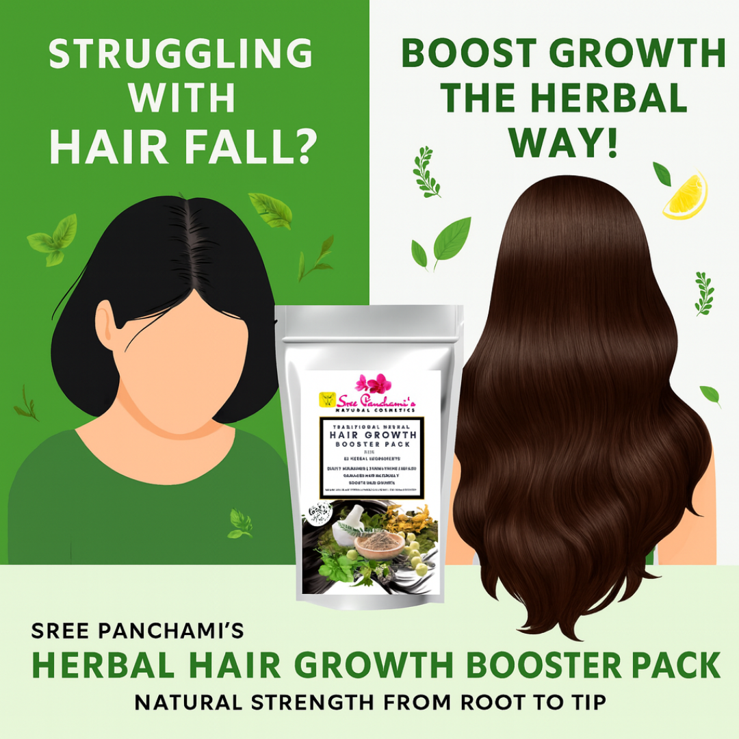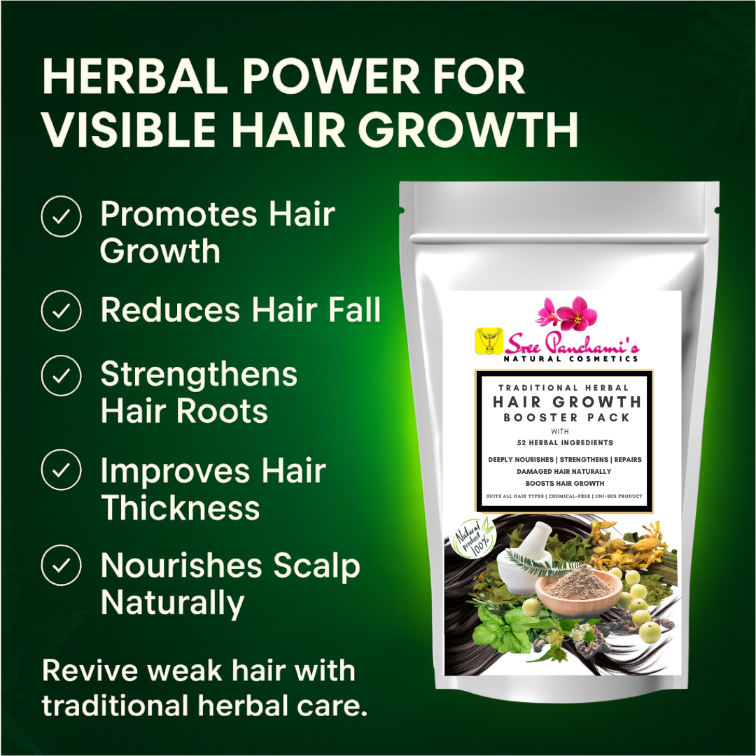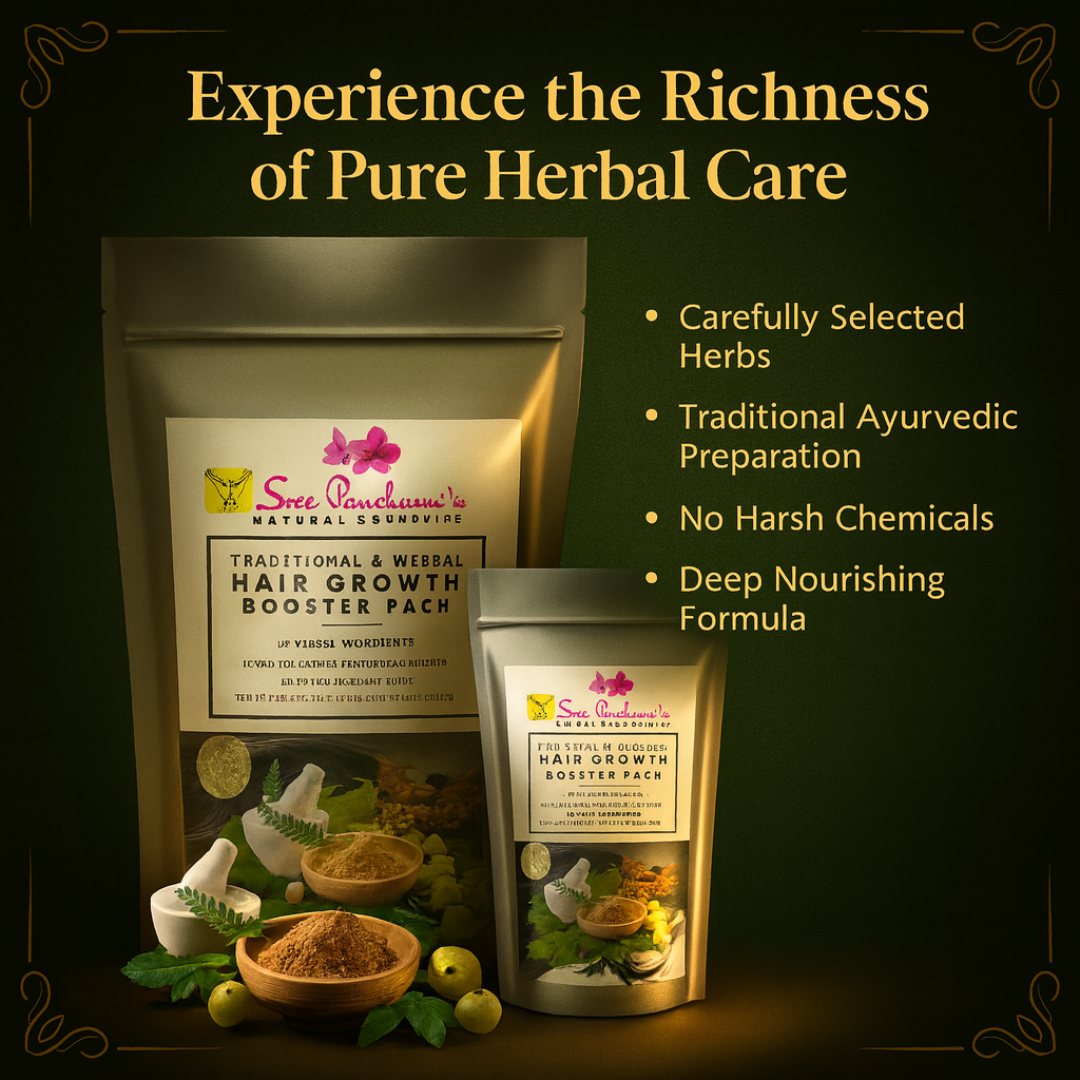 Say goodbye to hair woes and hello to accelerated growth! Introducing Sreepanchamiβs Herbal Hair Growth Booster Pack β a potent fusion of Ayurvedic herbs, roots, and plant-based nutrients designed to rejuvenate your scalp, strengthen hair from the roots, and promote thick, healthy growth.