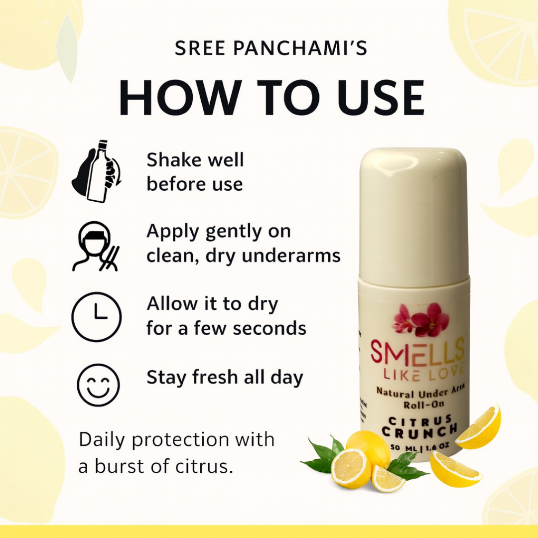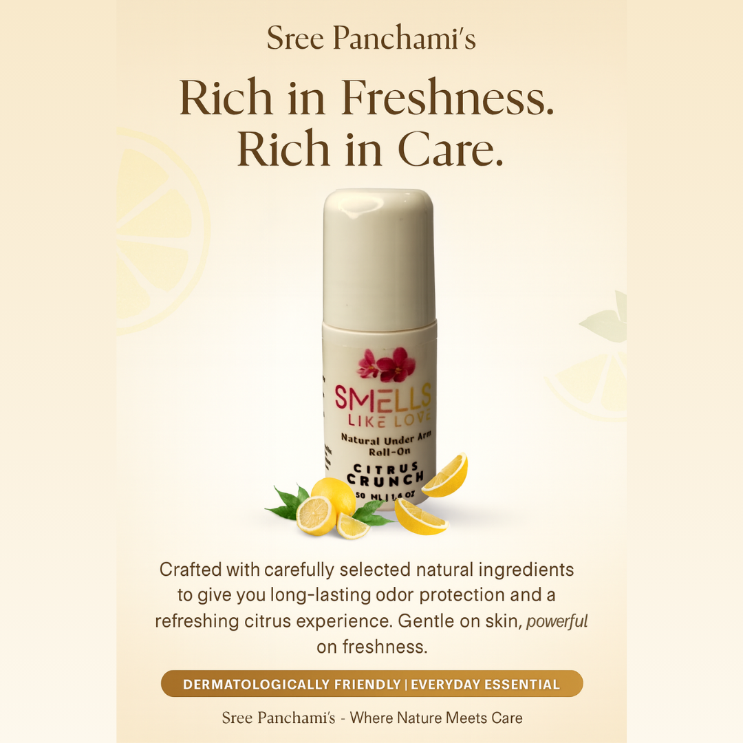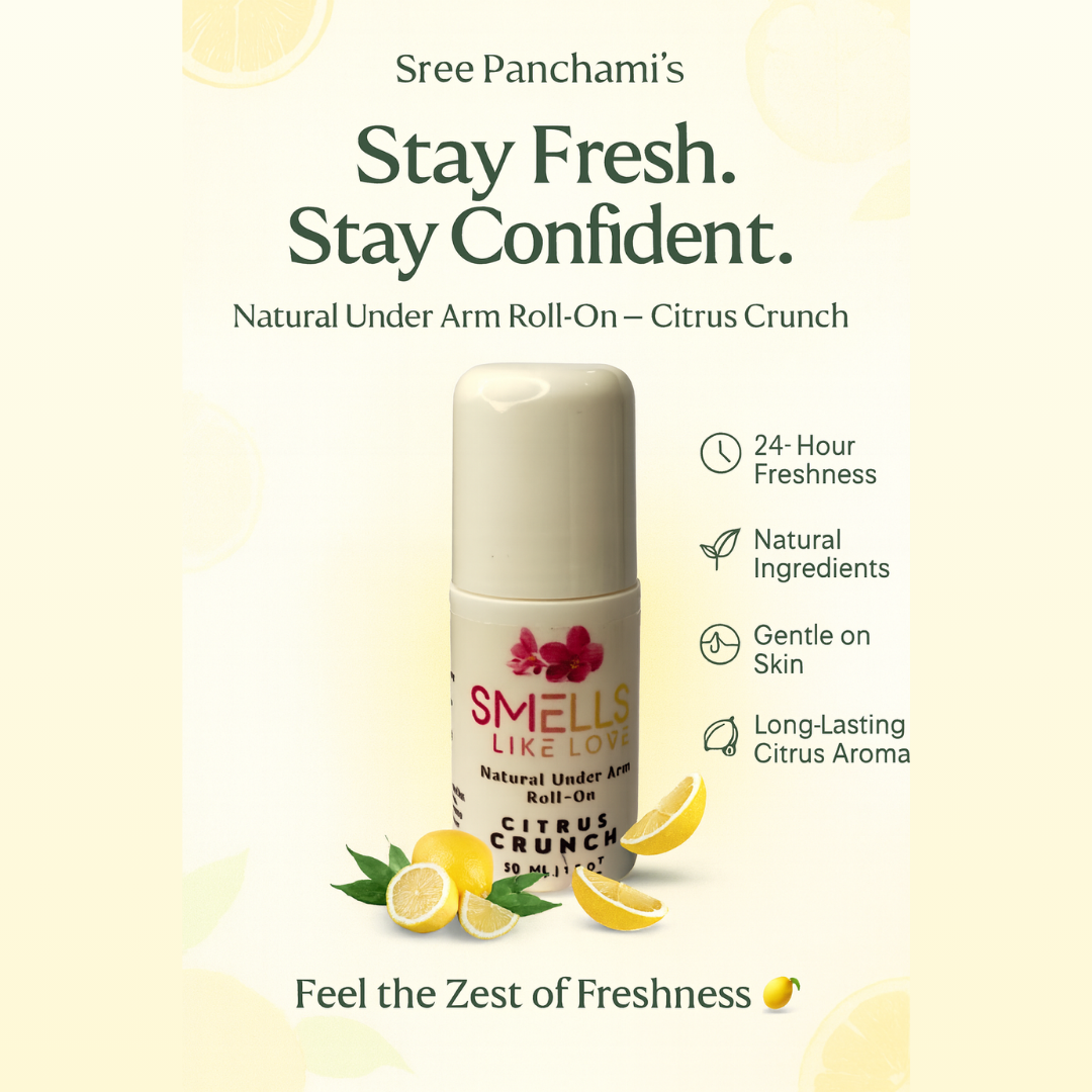 Say goodbye to harsh deodorants and hello to zesty, herbal freshness! Introducing Sreepanchamiβs Natural Under Arm Roll-On β Citrus Crunch β a skin-friendly, aluminium-free formula powered by natural actives and uplifting citrus oils to keep you feeling fresh, dry, and confidently odor-free all day.
